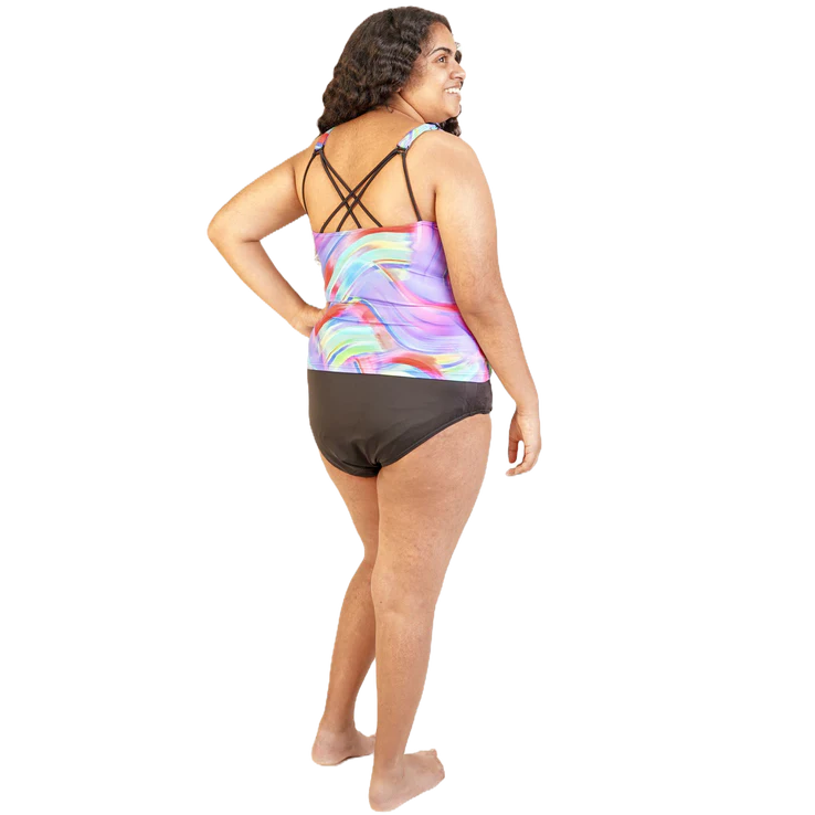Ladies' Tankini with high waist briefs—A two-piece vest and waterproof briefs for ladies suffering from incontinence made with recycled fabric and packed in recyclable packaging.