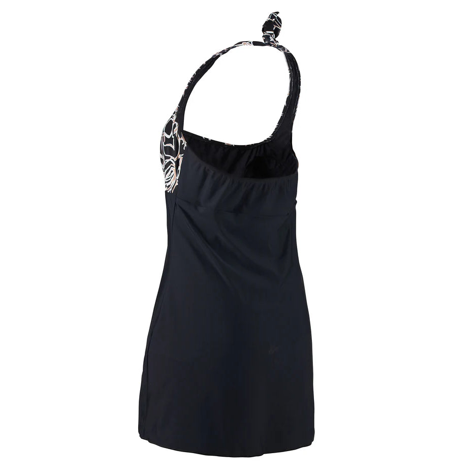 Divatos fazonú női fürdőruha, fekete virágos felsőrésszel. Nem esik le a vállról, mint más fürdőruhák. A nyakpánt rugalmas, ami extra rugalmasságot biztosít. Környezetbarát, újrahasznosított anyagból készült.